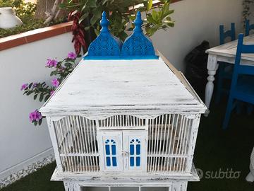 Vendo voliera in legno realizzata a mano, con parte sottostante chiusa in vetro per evitare la dispersione delle scaglie di mangime.
