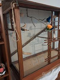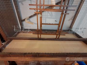 Voliera in legno con accessori come da foto, costruzione artigianale, non ne trovate un’altra uguale. Dimensioni: larghezza 120, altezza massima 100, profondità 50cm. Ritiro a Cavenago d’Adda.