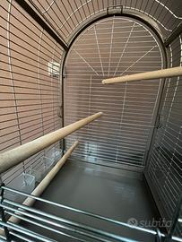 Voliera a doppia apertura (laterale e superiore) tenuta in ottimo stato, utilizzata pochissimo, per pappagallo/i anche di medie dimensioni (es. Cenerino-Brasiliano) dotata di n.3 trespoli, n.2 bicchieri per acqua/cibo e plexiglass di contenimento e protezione su tutti i lati della voliera.