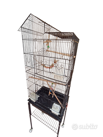 Gabbia per uccelli usata ma in ottime condizioni, con ruote per facilitare lo spostamento. Completa di accessori altalena..scaletta..ecc.