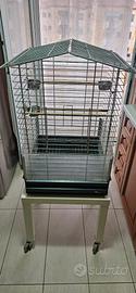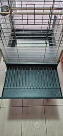 voliera in Buonissime condizioni con plastiche per non far cadere mangime affidabili e lavabile di cui cassettone sotto sfilabile e lavabile sopra in alto si apre e si mette il bastone per far uscire il pappagallo buone condizioni Carello sotto bianco con rotelle per sport portarla da una parte all'altra in omaggio ottimo affare