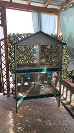 Voliera rettangolare grande a 4 scomparti con divisori removibili. Completamente in acciaio. Misure 105x60xh175. Ideale per esterno. Tenuta bene. 4 mangiatoie incluse. Piccole ammaccature sul tetto causa grandinata ma, essendo verniciata a forno, non ne ha pregiudicato la vernice che risulta intatta.