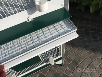 Gabbia spaziosa e resistente tra le voliere per gli uccelli di tutte le specie A due scomparti Otto accessori compresi nel prezzo: 4 beverini - 2 posatoi in barre profilate tonde da mt 1- 2 mangiatoie con antispreco cm 20 x 6 x H 4 Idonea anche per l'esterno Munita di ruote In lamiera verniciata bianco/verde Sono verniciati in verde i frontalini, il tetto e le porte Rimuovendo il divisorio centrale si ottiene un volo unico e un solo grande scomparto Estraendo la padella e la griglia, il divisorio mantiene separati i due scomparti Ciascuno scomparto è dotato della sua padella estraibile per deiezioni Su ciascuna padella vi è una griglia di protezione estraibile che impedisce il contatto con le deiezioni Porte in lamiera e rete di colore verde, con apertura a ghigliottina, cm 18 x H 18 Massimo ingombro: larghezza cm 82 x profondità cm 65 x H 161 Misure utili interne cm L 60 x P 50 x H 131 Misure dello scomparto inferiore cm L 60 x P 50 x H 60 Misure dello scomparto superiore cm L 65 x P 52 x H 70 al colmo del tetto Maglia della rete mm 10 x 100 Diametro del filo mm 2 Peso kg 25 ca