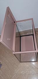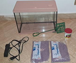 Vendo acquario Zolux, (misure base 40x28 cm, circa 30 litri di capacità). Il kit include: Vasca in vetro con coperchio coordinato. Filtro/Pompa interna per la pulizia dell'acqua. 2 confezioni di sabbia decorativa "AquaSand" color viola (nuove/sigillate). Retino per pesci. Confezione di mangime in granuli.