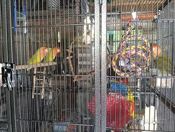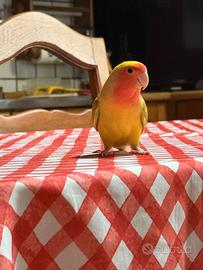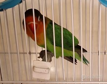 Si vendono a modico prezzo due esemplari dí inseparabili ( uno razza Fisher e una razza Roseicolles) di 10 mesi. Sono stati allevati a mano e parzialmente abituati al contatto umano. Possibilità di vendita della loro voliera con accessori anche.