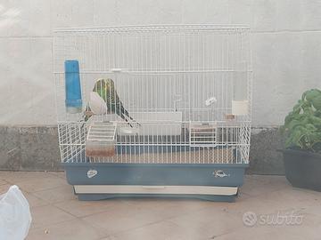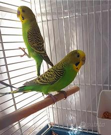 Cocorite con gabbia, una coppia riproduttiva (maschio verde oliva e femmina verde chiaro) più una figlia verde chiara di pochi mesi. 50 euro