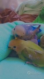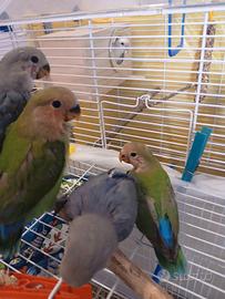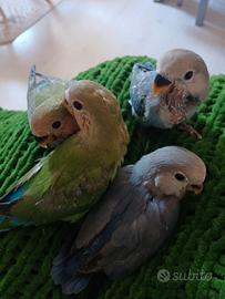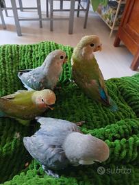 4 Bellissimi inseparabili allevati a mano, pronti per nuove famiglie 2 verdi uno azzurro e uno grigio viola. Solo se interessati e amanti degli animali hanno 42 gg più o meno nati in diversi gg un uno dietro l'altro Offro serietà e correttezza