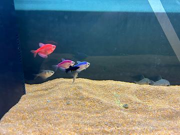 pesci colorati, uno viola, uno rosa, uno blu, due grigi, e due pulitori vendo solo tutti assieme. Il prezzo è 25 ? tutti e sette, con cinque euro in più cedo anche il cibo e con altri cinque euro anche le piante e decorazioni e con 20? cedo anche riscaldatore della flower