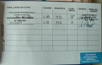 Splendido esemplare maschio di 2 anni e mezzo, pedigree, antenati campioni internazionali di bellezza, primo di categoria di razza in competizione amatoriale, secondo in competizioni nazionali ed internazionali, esente displasia certificata su pedigre, disponibile per accoppiamento con femmina certificata con analisi DNA (che io ho fatto) perchè voglio assolutamente che i cuccioli escano sani. Le analisi displasia sono state effettuate quando aveva oltre 15 mesi per avere la garanzia che non avesse problemi con l'età (molti fanno le analisi da cuccioli ma poi la displasia si presenta con l'avanzare degli anni). Mantello simmetrico, banderuole agli anti anteriori, pouff sulla coda di colore bianco. E' un border di BELLEZZA, non di lavoro. Chiedo compenso solo se la cucciolata va a buon termine. Dolcissimo di carattere, disponibilissimo a valutazione preventiva. Prezzo trattabile.