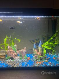 Acquario di 100 l con pompa filtro e riscaldatore, due pesci pulitori, uno giallo e uno nero, sei pesci, gruppi tre molli prezzo trattabile