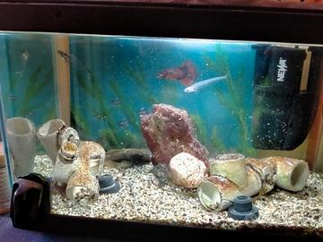 1 Vendo acquario di piccole dimensioni,con pesci e accessori, comprato da poco. 2 pesci fantasma ovvero trasparenti,2 anguilline colorate,1 Guppy,1 pulitore.misure acquario 20×40×27 h.Compreso mangime e altri prodotti.