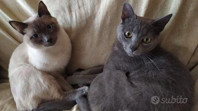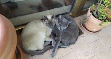 Macchia (siamese) e Matis (certosino grigio/blu). Hanno 8 mesi, castrati, vaccinati, fatto tutti i test e, come vedete, in splendida forma (beati loro). In cerca di qualcuno fidato che li prenderebbe possibilmente insieme (sono fratellini e legatissimi)