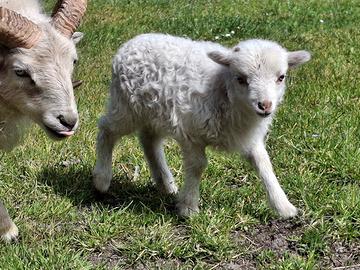 Prenotabili agnelli maschi di pecora nana, un maschio nero e uno bianco.