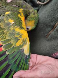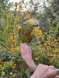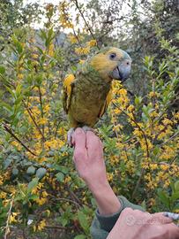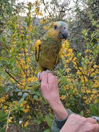 Amazzone allevata a mano buona è un maschio ha 7 mesi la sera prende sempre la pappa.Possibilità di fare video chiamata.Il prezzo è piú basso perchè ha il becco di sotto leggermente deviato.Possibilità di spedizione in tutta Italia con corriere autorizzato