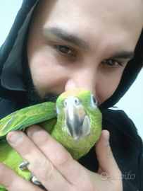 Amazzone Fronte Gialla (Amazona ochrocephala): Conosciuto per il suo piumaggio dai colori vivaci e per la grande capacità di imitare suoni e parole. Questo pappagallo è particolarmente socievole e adatto alla vita in famiglia.