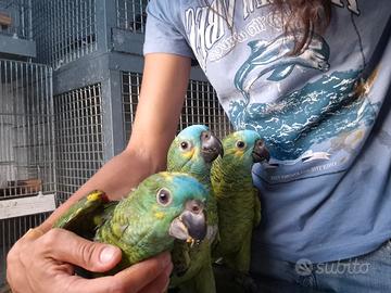 Disponibili amazzoni fronte blu allevate a mano molto docili. appena svezzate. In regola con la documentazione cites. Disponibili anche altri pappagalli ara ararauna conuri del sole caicchi testa nera e testa gialla. Umbria Gubbio. No perditempo, NON rispondo a MAIL CONTATTARE 350 1892525 .