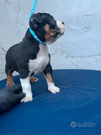 Femmina di American bully femmina , nata il 5 gennaio , colorazione manto tricolor black antan , dispone già del cedolino abkc se la si vuole con il pedigree , verrà ceduta sverminata e vacinata e con il libretto sanitario . Per info 3517127860
