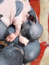 Razza American hairless terrier Riconosciuta non FCI Età ciccioli 75 giorni In consegna dal 10 aprile. I cuccioli saranno consegnati con vaccino CEPPI L4, 3 sverminazioni , visita veterinaria di Stato buona salute, kit cucciolo. Razza senza pelo, adatta a persone allergiche al pelo. Sono affettuosi e molto giocherelloni. Per qualsiasi informazione in merito scriveteci.