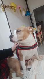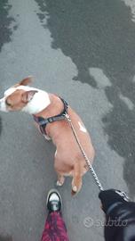 Cane Amstaff femmina in regalo, con microchip, vaccini e libretto sanitario. In ottima salute, ha 5 anni. Mantello fulvo e bianco, tipo di pelo: raso. Taglia media.