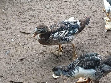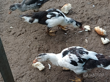 Anatre mute di 3/4 mesi sono allevate all aperto su distese di erba . Colorazioni bianca,blu/verde e bianca e anche alcune color cioccolato. Prezzo 20€ l una sia maschi che femmine.