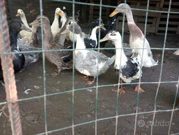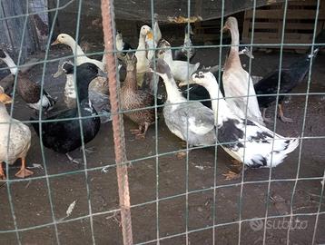-quattro maschi e due femmine di corritrici( una femmina nana colore trota una femmina bianca con ciuffo un maschio nero uno bianco uno giallo blu e uno colore germano)