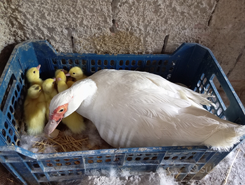 Disponibile 5 anatroccoli di Anatra Muta tra cui 4 femmine bianche e uno barrato maschio... Nidiata di anatre mute di ceppo autoctono bianco..nati il 5 giugno 2025 da cova naturale.. rinsanguati .. cioè non hanno lo stesso sangue le femmine con il maschio