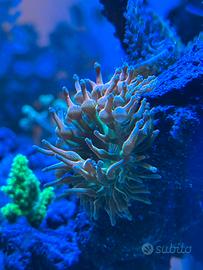 Splendida anemone a bolla con colorazione rosso-verde intensa, ideale per acquari marini reef. Esemplare sano, ben espanso e reattivo alla luce, con tentacoli carnosi e punte a "bolla" molto marcate.