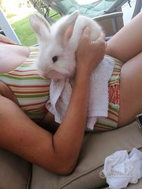 Regalo 2 coniglietti nani femmina, uno bianco razza angora ed uno blu razza ariete. Hanno 1 anno e mezzo di età circa. Abituati a stare all'esterno,coperti da un telo protettivo solo con le gelate.