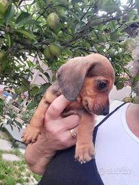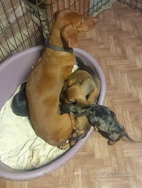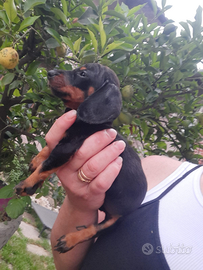 Cuccioli di bassotto nano pelo raso nati il 18 aprile,verranno consegnati svermati svezzati con primo vaccino microchip e libretto sanitario verranno consegnati i primi di luglio quando avranno compiuto almeno 75 giorni e solo quando saranno indipendenti dalla mamma..1 femminuccia nero focata,2 maschietti fulvi e 1 maschietto arlecchino fulvo..il prezzo varia in quello arlecchino