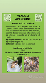 Vendesi api regine razza Buckfast e Carnica selezionate da madri F0 per info Michela 340 635 2151