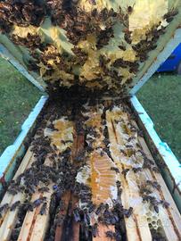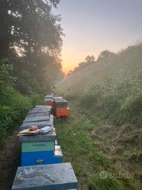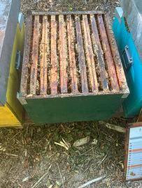 Cedo per esubero famiglie su 10 telaini compresa la cassa . La foto è del 10 luglio 2025 . Le famiglie sono state trattate e sempre curate in modo maniacale . Le famiglie non necessitano assolutamente di essere nutrite stabordano di scorte fino alla prossima primavera . Scorte fatte post tiglio .Regina 2025 marcata azzurra