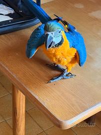 Ara ararauna nata 08/25 allevata a mano e completamente svezzata. Nel prezzo è incluso tutta la sua fornitura rimasta di mangimi