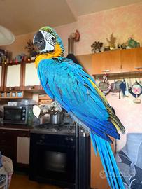 Ara ararauna nata 08/25 allevata a mano e completamente svezzata. Nel prezzo è incluso tutta la sua fornitura rimasta di mangimi. In regola con tutta la documentazione e anello irremovibile