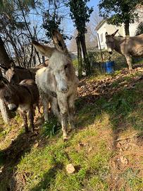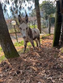 Bellissimo asinello pezzato bianco di 6 mesi, molto docile e gia abituato al contatto umano. Cresciuto all'aperto, abituato a prato e bosco Abituato a recinto elettrificato e cani da pastore Convive tranquillamente con altri animali tra cui cavalli, mucche, galline ed altri animali da cortile Genitori di taglia media, circa 140cm al garrese È un animale ideale sia per compagnia che per piccoli allevamenti. In regola con Cip identificativo Libretto sanitario Vaccinazioni compresa antitetanica Trattamento vermifugo Prezzo di 350€ con trasporto a carico dell'acquirente, leggermente trattabile se veramente interessati. Per maggiori informazioni o foto contattatemi senza impegno