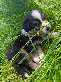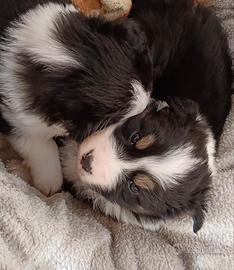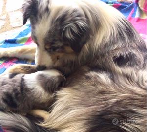 Cucciola black tricolor di 1 mese con red factor e coda lunga nata in famiglia da mamma red tricolor con pedigree e papà blue merle entrambi sani, equilibrati e visibili.