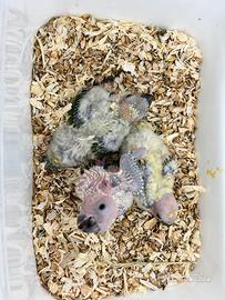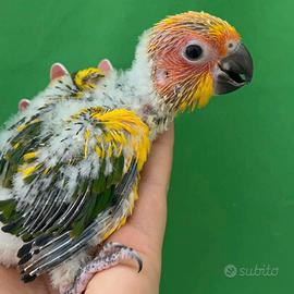 Pulli di conuro del sole imbeccato a mano e quindi abituati al contatto umano, Pappagalli dai colori vivaci e giocherelloni.