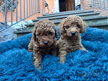Bellissimi cuccioli di barboncino fenotipicamente prevalente rosso intenso, simpatici, giocherelloni e amorevoli, il miglior compagno, due mesi, 2 maschi, genitori visibili Toy mamma 27 cm, con microchip 380260044203559,Papà 24 cm con microchip 941000022608353 tutti e due con test genetici e FSA per la lussazione della rotula. Si cedono con 1 ° vaccino, microchip, iscrizione anagrafe canina, certificato di buona salute e analisi delle feci. Interessati scrivere su WhatsApp.
