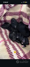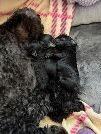 Cucciole di Barboncini toy nate il 4 aprile, disponibili ai primi di giugno/ metà giugno 1 nera con zampe e petto bianchi 2 con colorazione phantom (nere con striature rosse) Figli di mamma toy nera e bianca al garrese 22 cm e padre rosso al garrese 22 cm, disponibili foto.