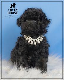 Cucciolo di barboncino nano nero disponibile subito, allevato presso Arven House. Allevamento professionale ENCI Genitori selezionati e testati Pedigree ENCI Con microchip e documenti ASL Cresciuto con attenzione e amore. Oleggio (Malpensa) Anna - Allevamento Arven House
