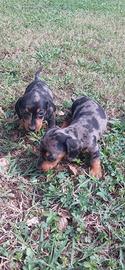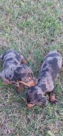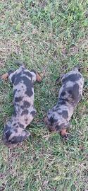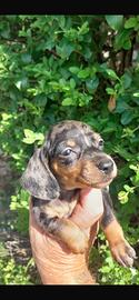 Bellissimi maschietti di bassotto Arlecchino disponibili . I cuccioli sono nati il 3/1/2026 , vivono in un ambiente famigliare. Genitori di proprietà visibili , mamma nera focata . Papà con ottimo pedigree enci , Arlecchino cioccolato .