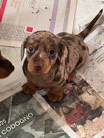 Disponibili su prenotazione bassottini colore (ultima femmina disponibile) arlecchino cioccolato presunta taglia nana nati il 13 dicembre con genitori confermati in taglia nano testati e con Dna depositato . Pedigree altissima genealogia. Allevamento riconosciuto Enci/Fci .Si consegneranno a fine febbraio/inizio marzo con pedigree, microchip, prima vaccinazione, 2 sverminazioni, certificato medico di buona salute emesso dal nostro veterinario di fiducia e puppy kit. gradito contatto telefonico, prezzo impegnativo, no perditempo o affaristi 3471052846