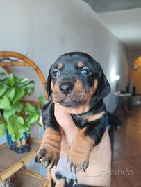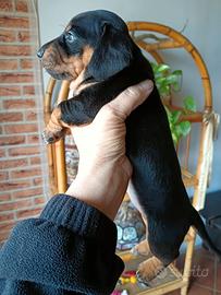 Bassotta cucciola nero focato nata il 20 aprile disponibile a luglio svezzato con primo vaccino e sverminazioni. Genitori visibili. Per info e prenotazioni contatto su WhatsApp al 349 43 12339.