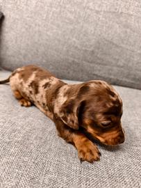 I genitori sono un bassotto standard chocolate e una bassotta arlecchina nana. Sono visibili e non hanno problemi, per informazioni 388 34 96 264, anche su WhatsApp.