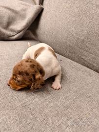Colori disponibili: femmina arlecchina chocolate, maschio bianco con chiazze chocolate, maschio nero focato.