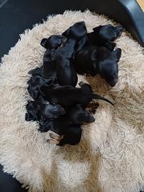 Splendida cucciolata di bassotti futura taglia kaninchen /nano piccoli nati il 16 Gennaio da madre nana piccola nera focata e padre kaninchen arlecchino silver con gene occhi azzurri ...