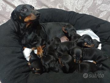 Disponibili da meta' Marzo a 60 giorni maschietti e fenminucce di bassotti nati il 16 Gennaio 2026...da madre nana piccola nera focata e papa' kaninchen arlecchino silver ...