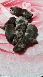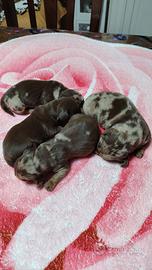 Disponibi cuccioli di bassotti nani kaninken nati il 11/04/2026 un maschio cioccolato un maschio arlecchino cioccolato e due femmine arlecchino cioccolate i cuccioli verranno consegnati con vaccino vermifuga completo microchip kit pappi e libretto sanitario genitori visibili sul posto possibilità di spedizione in tutta Italia con corriere di fiducia