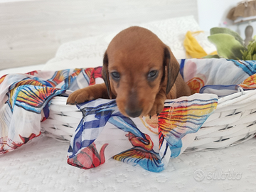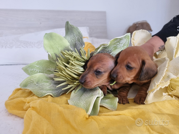 Cucciolata di bassotto pelo raso,vengono consegnati con vaccino, microchip, sverminati, pedigree, e iscrizione all'anagrafe canina nazionale ,taglia nana e kaninchen sono tutti di una linea di sangue pura figli di campioni di bellezza.