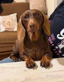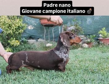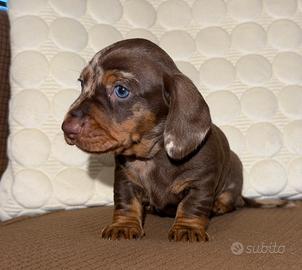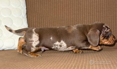 Disponibile alla prenotazione bellissimo maschio di bassotto tedesco cioccolato arlecchino, verrà ceduto a 60 giorni il 21 gennaio, vaccinato sverminato microchip e pedigree enci, mamma kaninchen, papà nano (giovane campione italiano) entrambi testati per le patologie genetiche ereditarie.