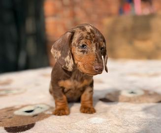 Disponibile alla prenotazione bellissimo cucciolo di bassotto tedesco,cioccolato arlecchino, maschio , verrà ceduto a 60 giorni il 22 febbraio, vaccinato , sverminato, microchip, pedigree enci, e puppy kit. Entrambi i genitori sono kaninchen, testati e esenti da patologie, padre multi campione. Possibilità di trasporto in tutta Italia, potete venire a vederlo di persona. Prezzo impegnativo. Per info 3271970019,